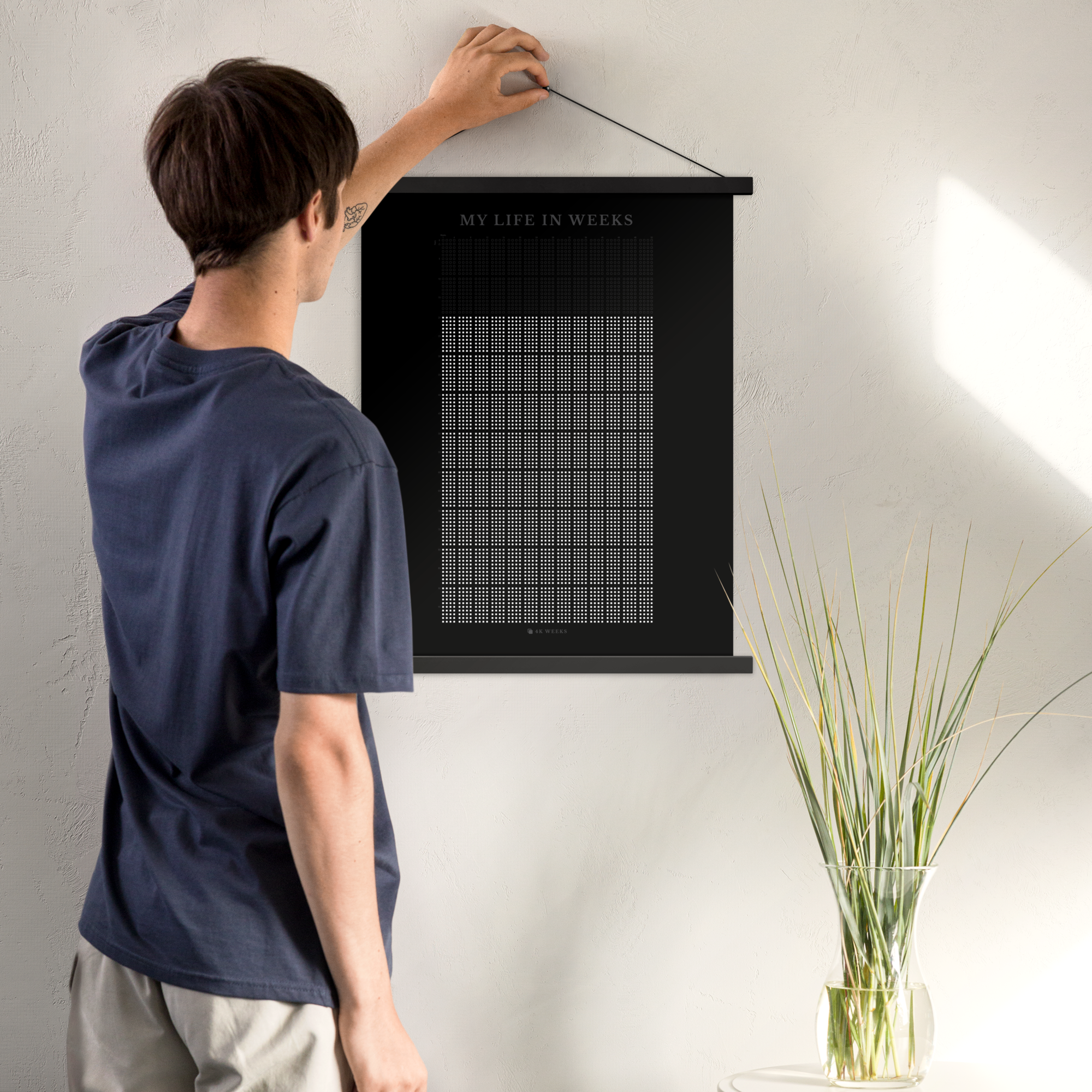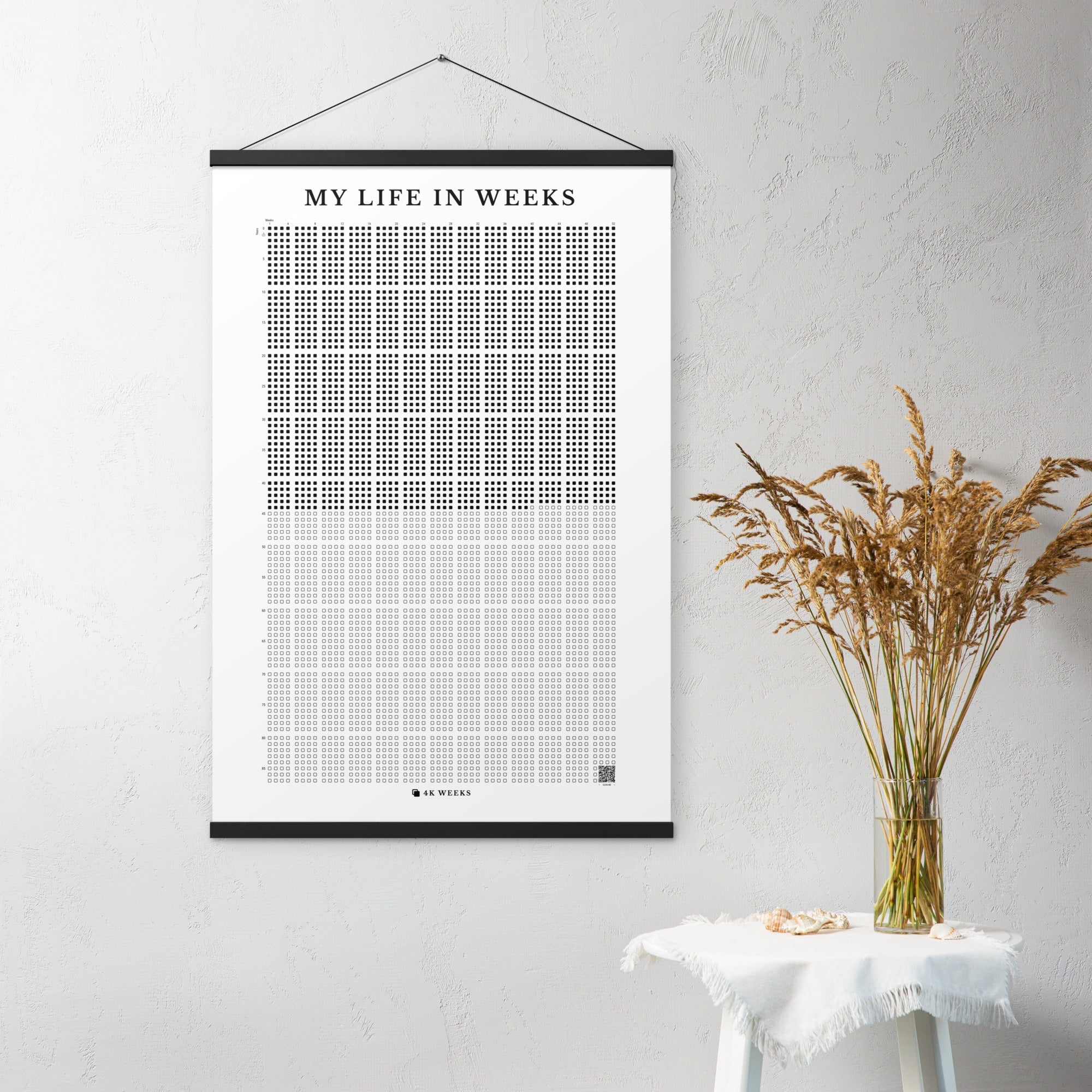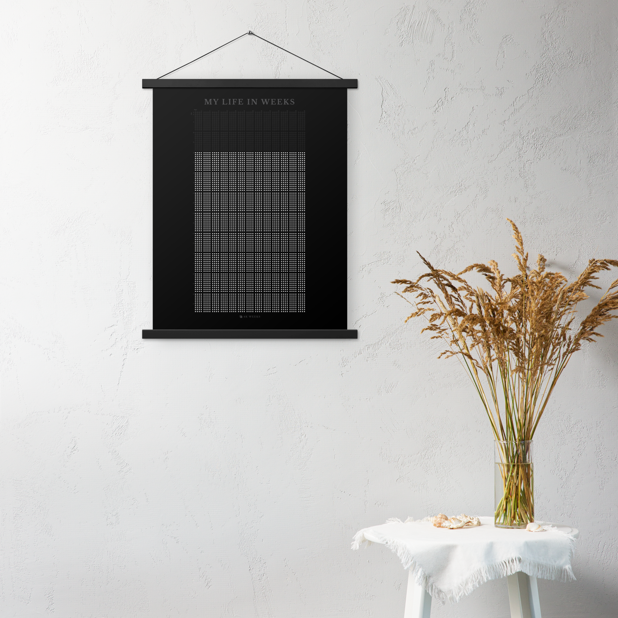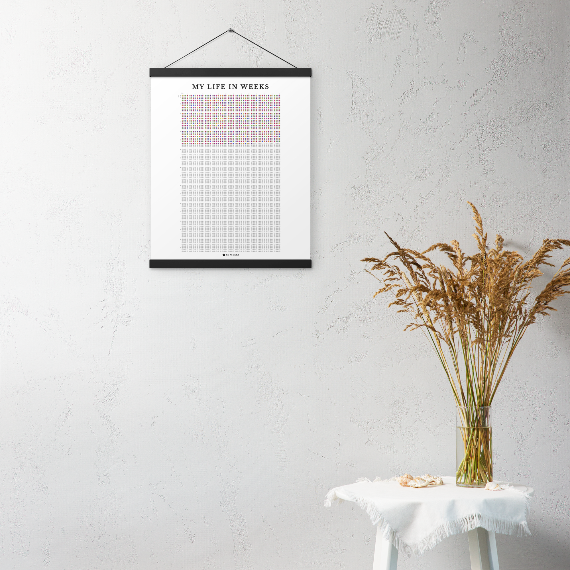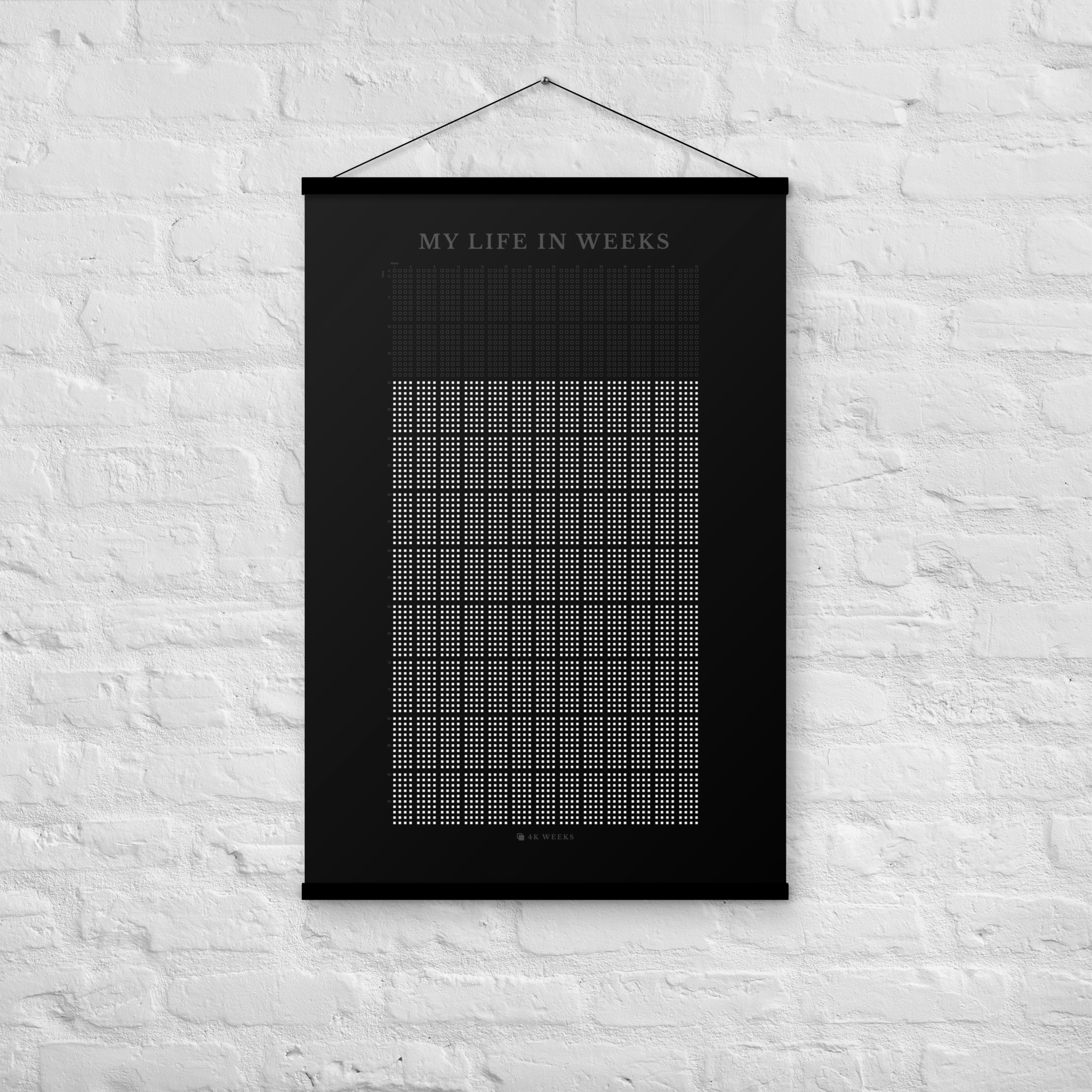 The 4K Weeks Tapestry takes the striking visual of your life in weeks and prints it on a durable archival matte paper and includes a magnetic black hanger bar for the top and the bottom.